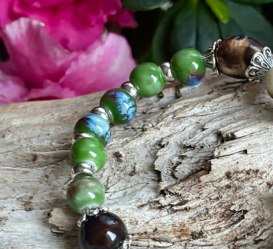 Ceramic Beads Elastic Bracelet With Tassel Charm - Beige & Green
