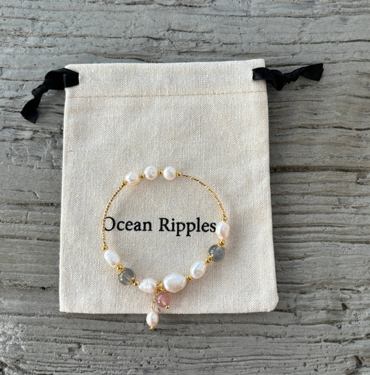 14ct Gold Plated Fresh Water Pearl Moonstone Elastic Bracele