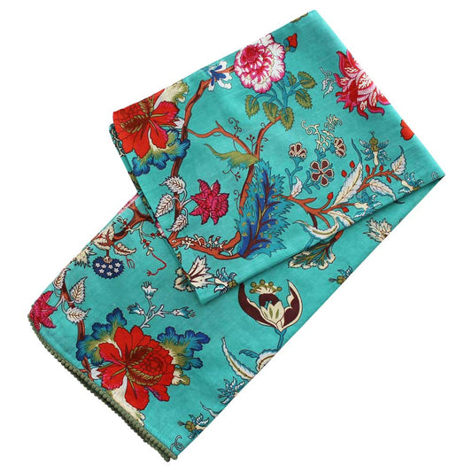 Teal Exotic Flower Scarf With Green Pom Pom Trim