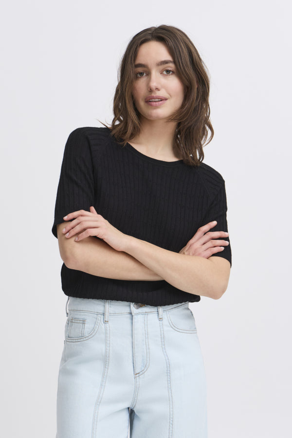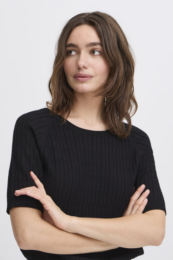 Introducing the B.young Omanja Pointelle Jumper, a stylish and versatile addition to any wardrobe. This short sleeve jumper boasts a beautiful back colorway and features stunning material and intricate detail. Elevate your look with this must-have piece.
