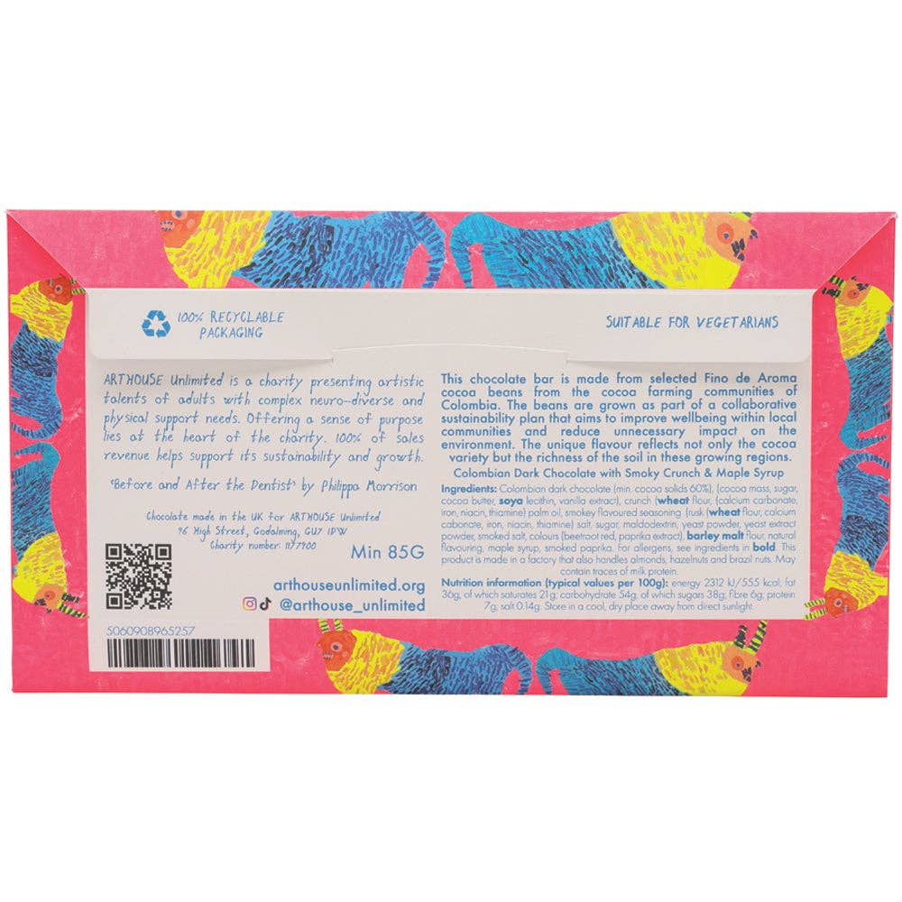 A delicious dark chocolate combined with a unique smoky crunch and a hint of maple syrup, wrapped beautifully in Philippa Morrisons bright artwork, made right here in the UK.