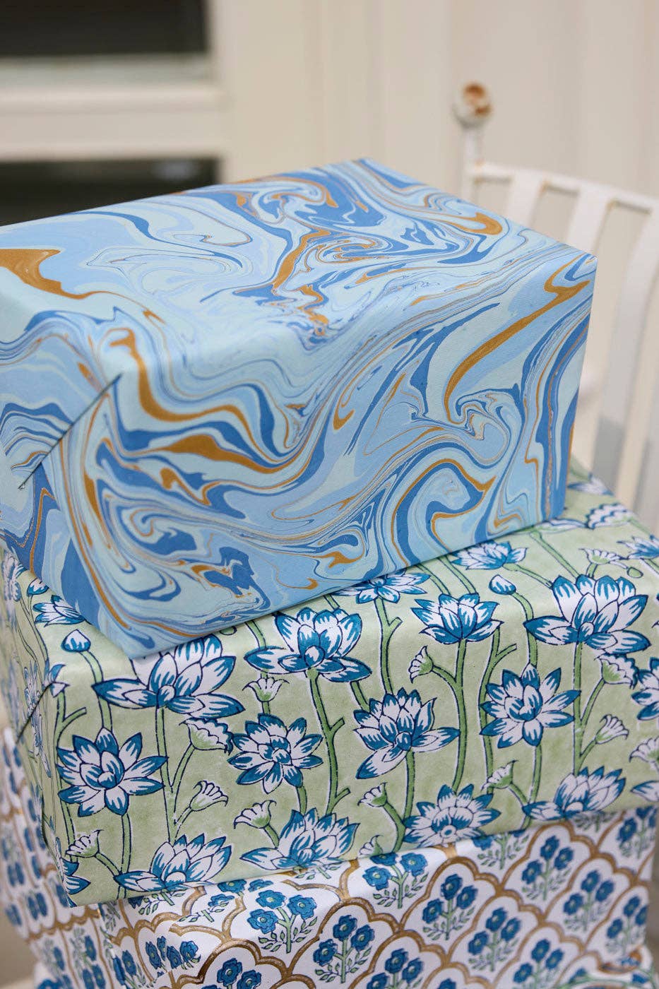 Block Printed Wrapping Paper Sheets - Lotus Indigo