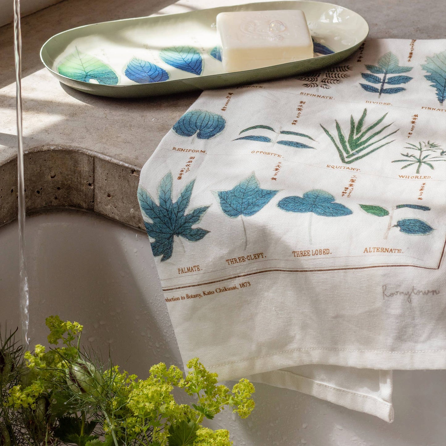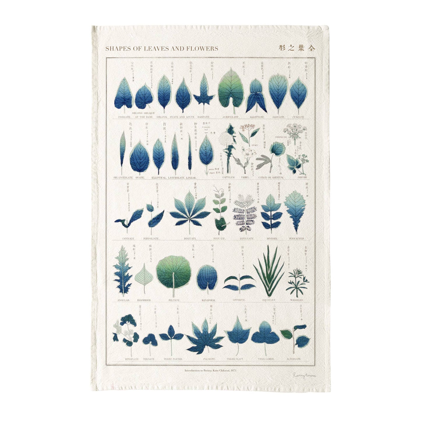 Featuring artwork reproduced from original illustrations by a Japanese artist published in a book about botany in 1873, this 100% Cotton Tea Towel showcases intricate drawings of Japanese leaves in vibrant blue and green hues and comes neatly folded and packaged with a card belly band. Machine washable for everyday use in your kitchen.