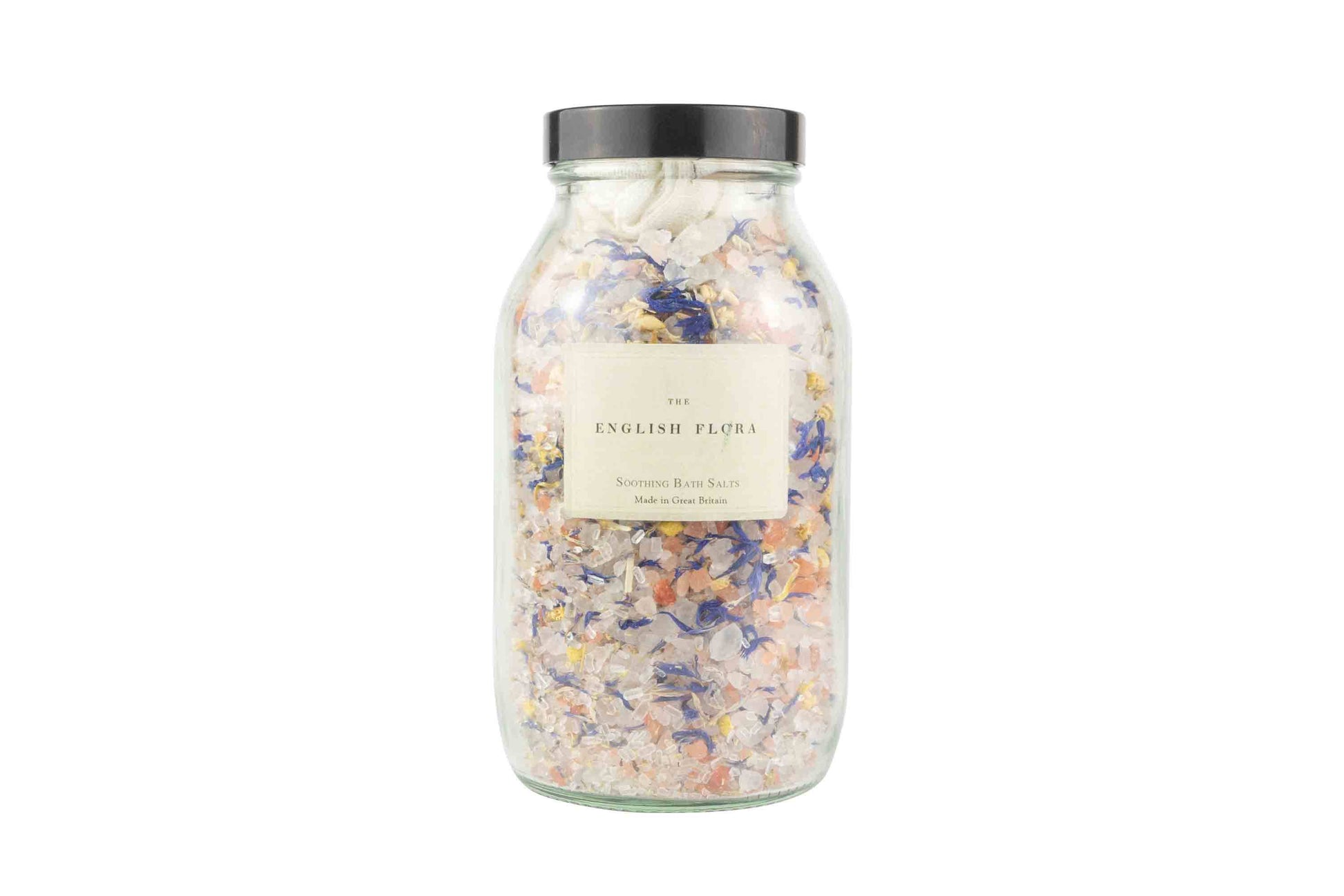 English bath salts 850g - soothing. Natural salts beautifully fragranced with essential oils blended with flower petal inclusions. Supplied with a cotton bag to decant the salts before dropping in the bath.