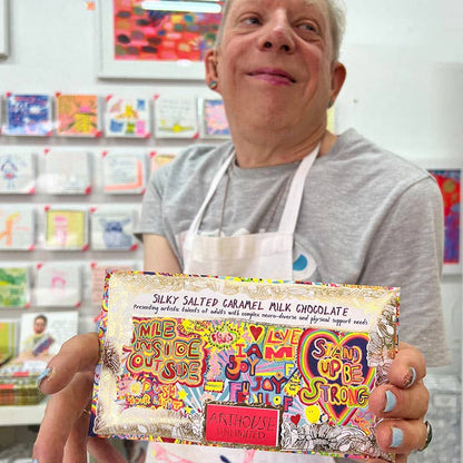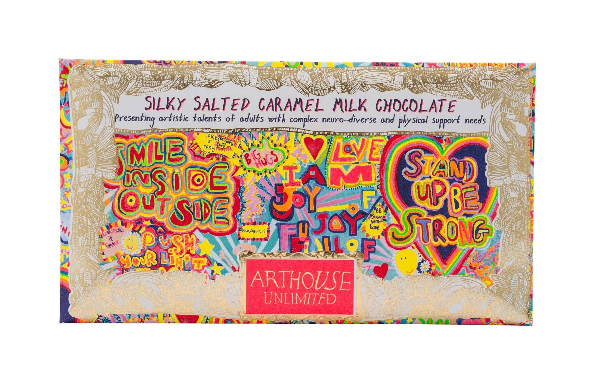 Oh, the joy! This mouth watering Silky Milk Salted Caramel Chocolate Bar is made in the UK with responsibily sourced single origin cocoa. Wrapped in foil & encased in a recyclable envelope, this chocolate bar presents the ARTHOUSE Unlimited artists' original Full of Joy artwork & positive affirmations in a dazzling gold frame. An ideal gift for art lovers, joy givers, chocoholics, party throwers & good-cause supporters everywhere!