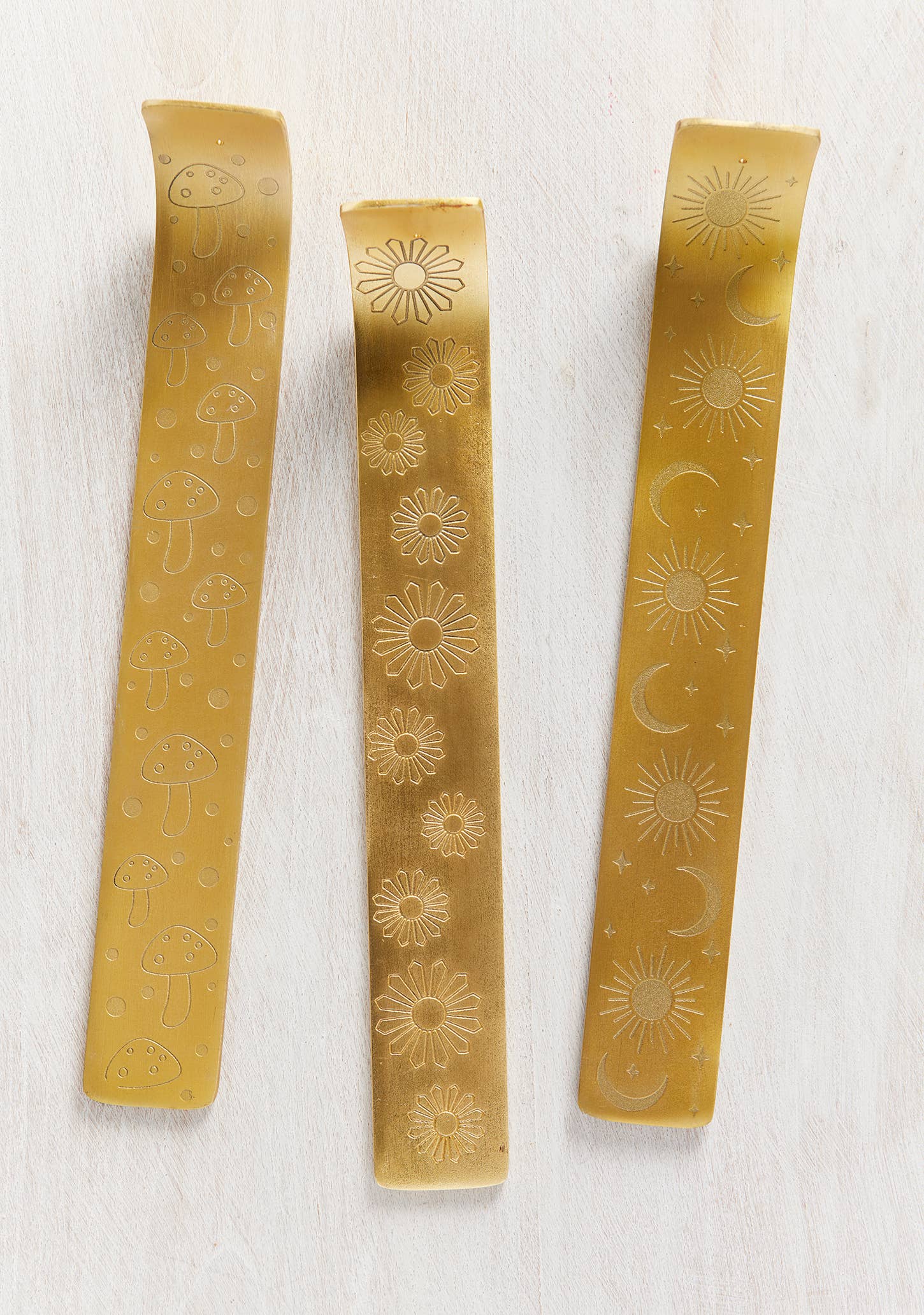 Discover a selection of striking gold-finished aluminium incense stick holders engraved with trendy designs of mushrooms, celestial suns, moons, stars, and flowers.