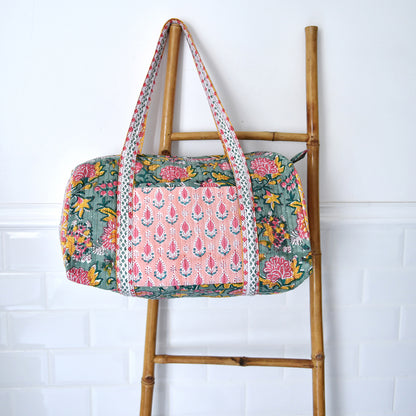 Green, Lemon & Pink Mixed Block Floral Zip Top Quilted Duffle Bag