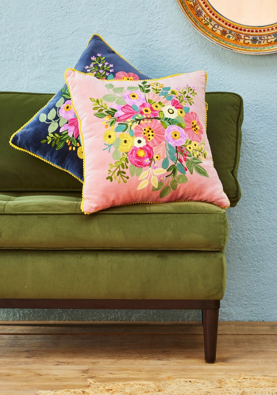 Jacinta is a joyful embroidered floral cushion cover in choices of pink and navy colourways. Featuring an assorted wildflower spray in a beautiful burst of colour on a plush cotton velvet front. Backed in plain cotton canvas of the same primary colour, it has a concealed rear zip and is edge-trimmed with a mini pom pom braid in complementary mustard. A traditional Indian soft furnishing full of depth and texture and an exquisite example of a decorative throw pillow or display cushion.