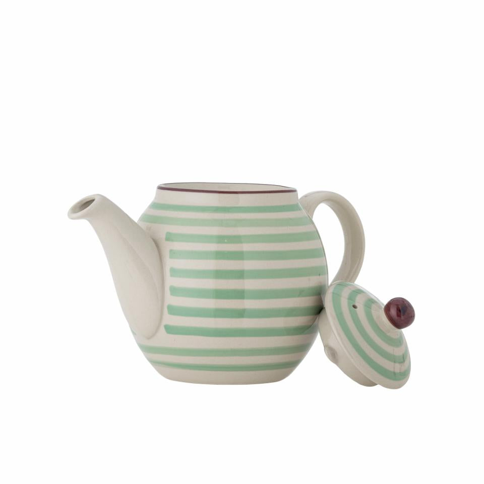The Patrizia Teapot by Bloomingville is made of stoneware and has a glazed surface with a striped pattern in green, white, and red shades. It is an ideal addition to any kitchen and is perfect for both everyday use and special occasions. The teapot can hold 1200 ml and is dishwasher, oven, and microwave safe.