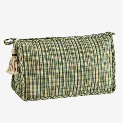 Quilted washbag adorned with a handmade tassel made from the women of Nai Disha's Empowerment Program in New Delhi.