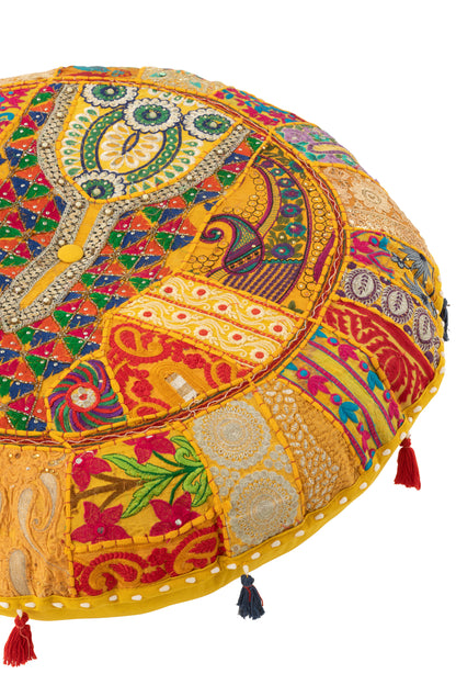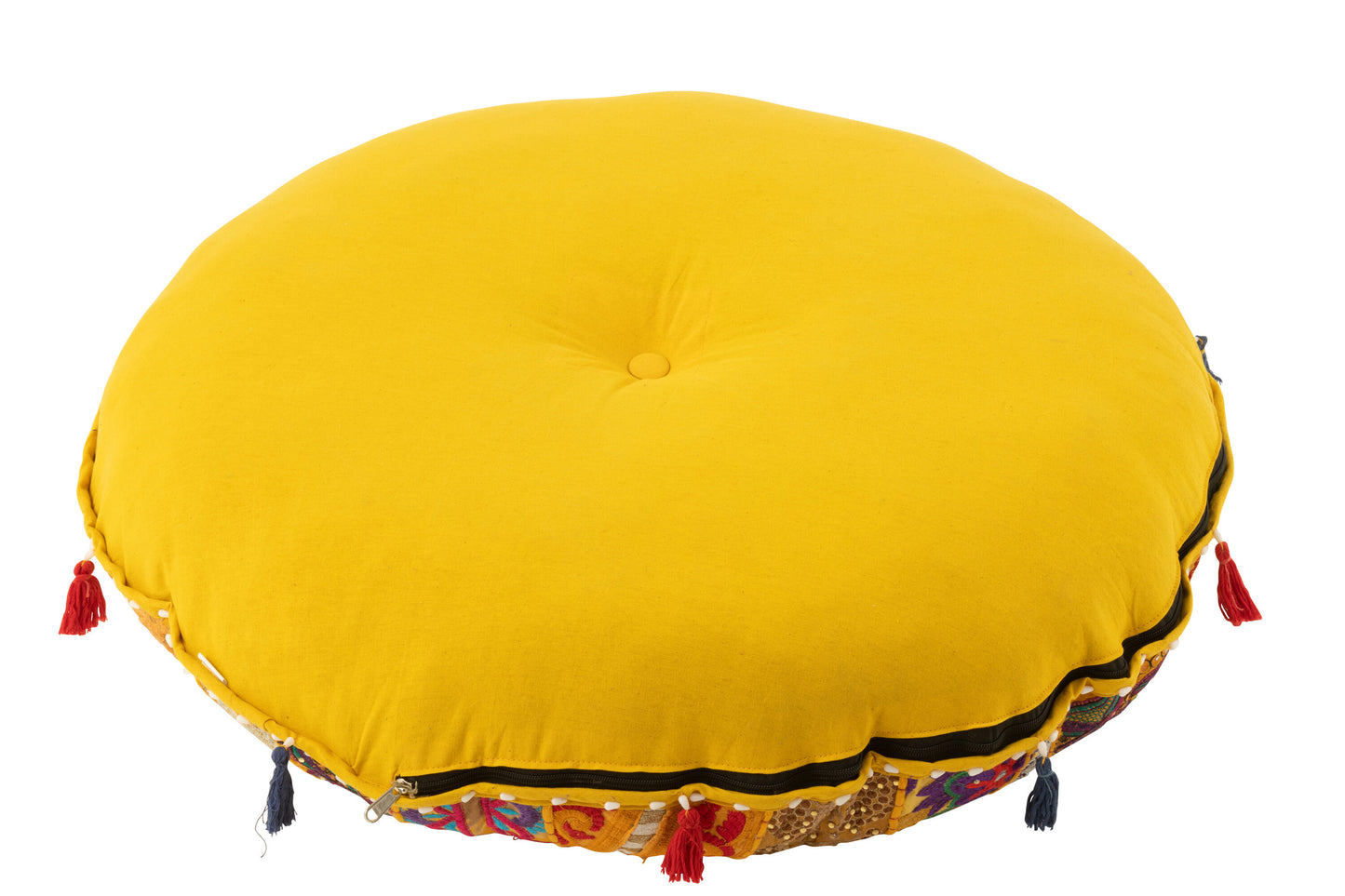 This round pouf features a vibrant yellow background adorned with an elegant pattern, making it a stylish and functional addition to your home. Its compact design and soft texture provide comfortable seating or a cozy footrest, while the decorative tassel adds a touch of artisanal charm. Perfect for brightening up any room, this pouf brings a warm, summery vibe to your living space with expert craftsmanship and thoughtful design.