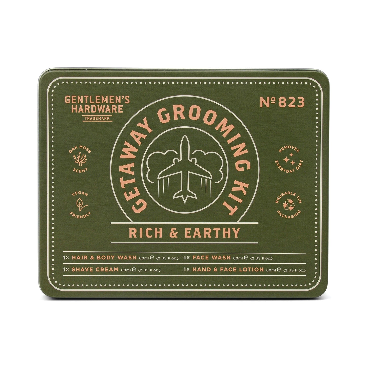 Equipped with 3-in-1 Wash, Shaving Cream, Face Wash, and Hand & Face Lotion, this compact kit has everything you need to look and feel your best. With vegan-friendly ingredients and an intoxicating Oak Moss scent, this kit makes the perfect gift or travel accessory, stored neatly in a reusable tin.